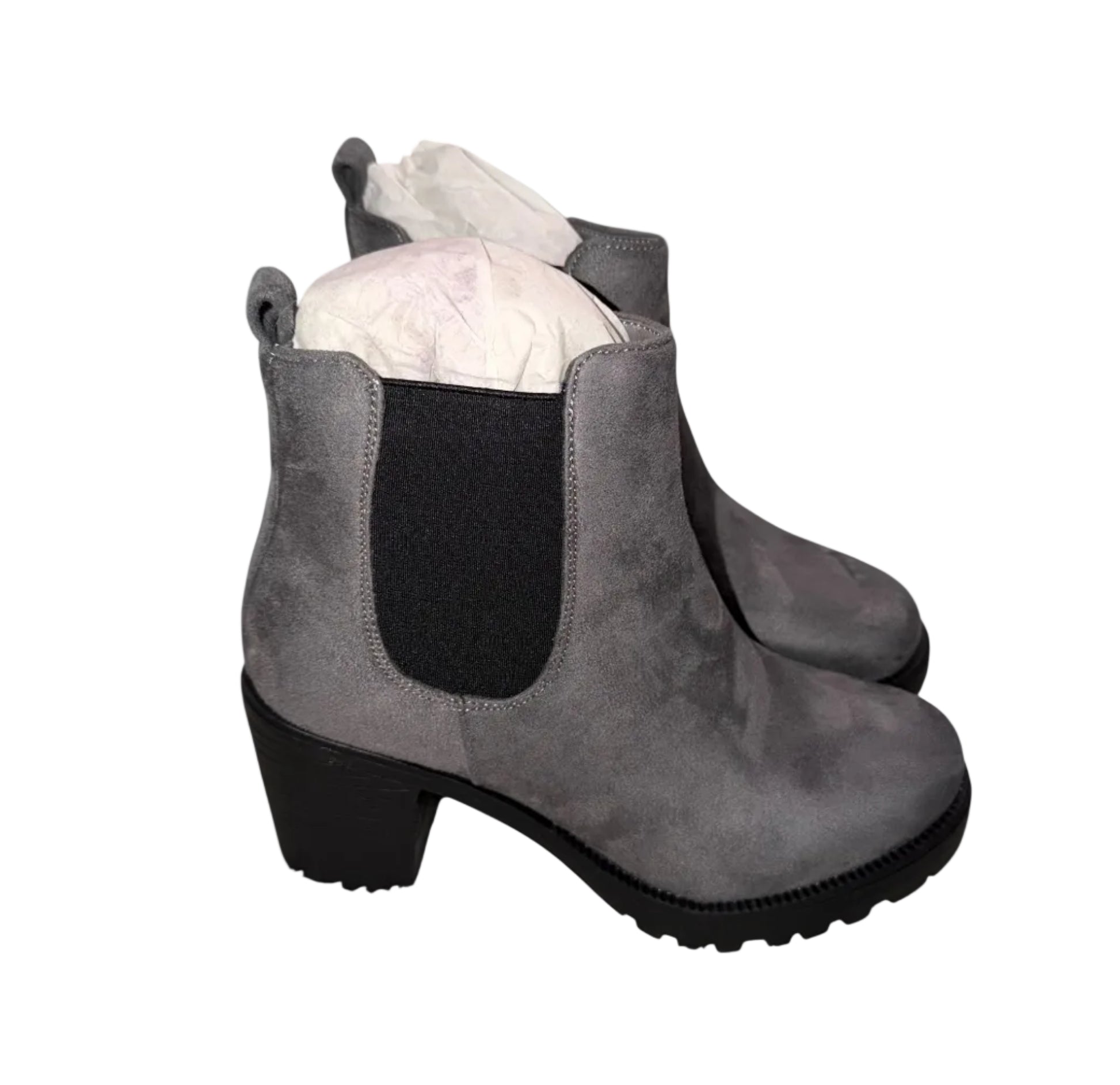 Stijlvolle enkellaarsjes van het merk Kayla, uitgevoerd in een elegante grijstint met suède-look. Deze laarsjes hebben een tijdloos Chelsea-model en zijn voorzien van een comfortabele blokhak en stevige profielzool voor extra grip.